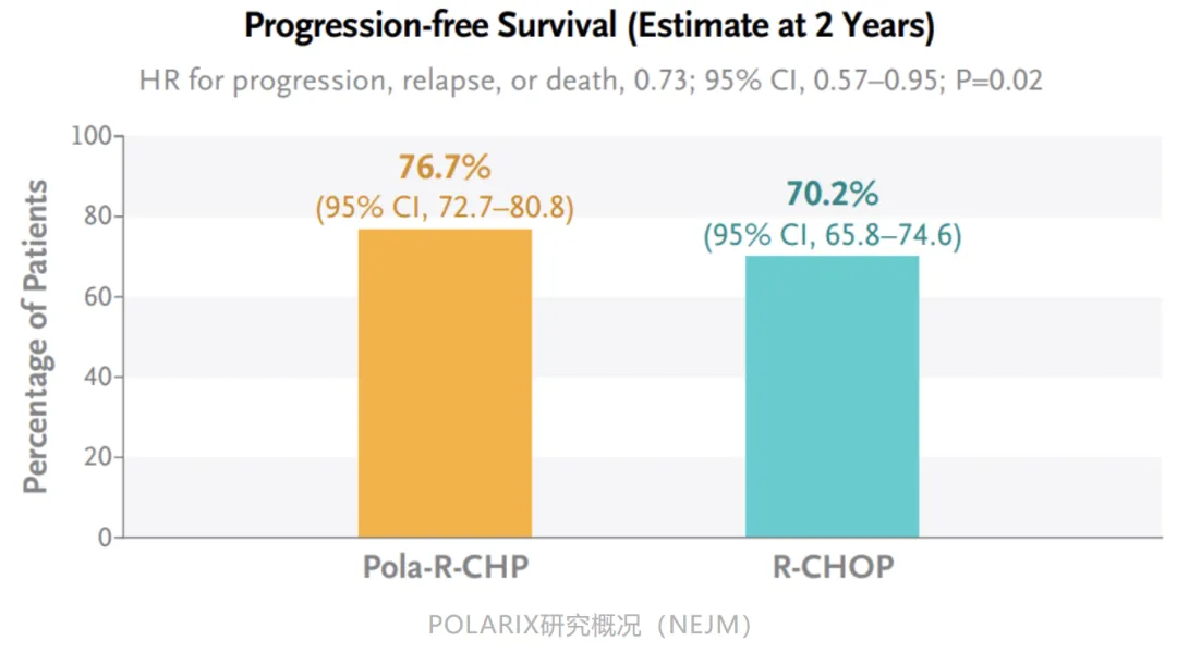 再看重点的一线治疗数据,在2021 ASH大会公布的POLARIX研究显示,Polivy+R-CHP方案(利妥昔单抗、环磷酰胺、多柔比星、泼尼松)相比R-CHOP疾病进展、复发或死亡的相对风险显著降低了27%,Polivy+R-CHP治疗组2年PFS率为76.7%,R-CHOP治疗组为70.2%,Polivy+R-CHP无事件生存期(EFS)和无疾病生存期(DFS)更优,总生存期无差异,且两组安全性相似。