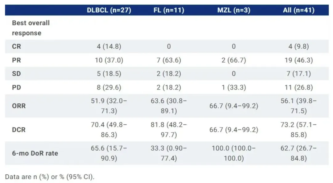 SHR-A1912在2024 ASCO大会公布的治疗B-NHL的I期临床数据显示,在DLBCL亚组中治疗组ORR 51.9%(最高3.6mg/kg剂量组ORR为77.8%),6个月持续缓解率62.7%,以及≥3级TRAE发生率40.8%(最常见为中性粒细胞减少)。