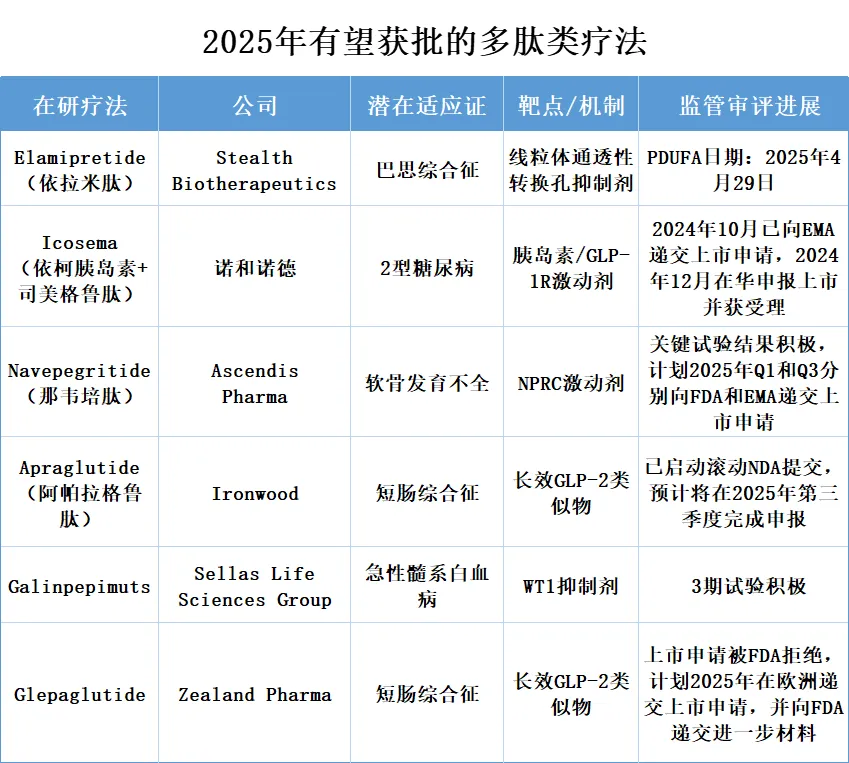 自1922年胰岛素用于治疗糖尿病,肽类药物正式登上医学舞台。发展至今,全球已有近100种肽类药物获批。据弗若斯特沙利文数据预测,到2030年,全球多肽药物市场规模将达到2108亿美元,其中中国市场规模占全球比重维持在15%左右。多肽药物市场中,糖尿病、肿瘤和罕见病是拉动多肽药物市场扩容的“三驾马车”。2025年,以下6款创新多肽药物有望首次获批。