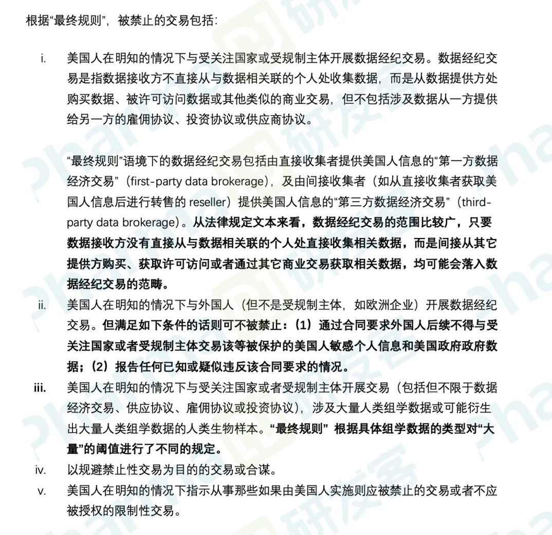 此外,《最终规则》还特别提到了美国有AI相关布局的公司(如药企、医疗器械企业和医药/医疗科技公司),这类公司可能会需要用到大量受规制数据来训练算法和开发产品。他们在向受关注国家和受规制主体提供算法或AI产品时,如果对方无法访问用于算法训练的底层受规制的数据,则不会违反《最终规则》。反之,相关行为会构成数据经纪交易,从而被禁止。