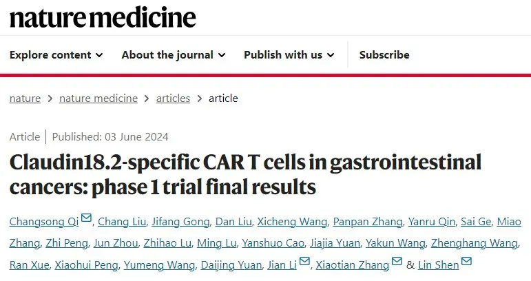 综上,晚期G/GEJA治疗效果差、预后差,而CLDN18.2阳性者属于其中预后更差的一类人群。二线治疗失败的CLDN18.2阳性晚期G/GEJA患者预期治疗的客观缓解率(ORR)、PFS、OS等疗效可能较全人群数据更差。尽管如此,在前期IIT中我们依然看到了舒瑞基奥仑赛为此类患者带来的巨大获益,作为全球最大样本量的针对CLDN18.2阳性消化系统肿瘤CAR-T治疗的试验,CT041-CG4006(NCT03874897)最终分析结果于2024年6月在医学权威杂志《Nature Medicine》发表。