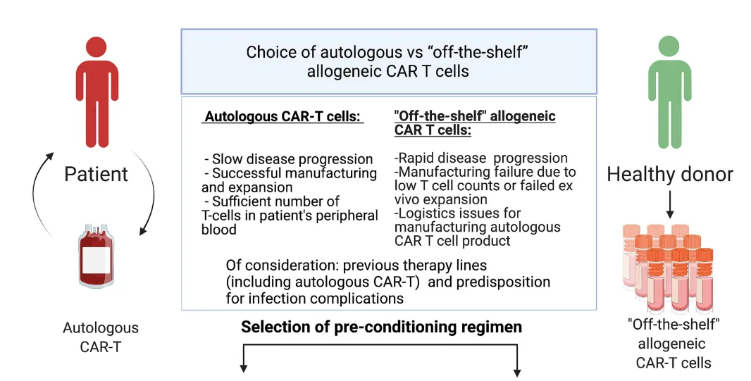 同种异体CAR-T细胞可以并且应该代替自体CAR-T细胞或与自体CAR-T细胞结合使用时,有几种情况:i)有阻碍自体产品制造的物流问题;ii)制造失败,其中同种异体产品可以替代自体产品,而不会延迟计划的输注;iii)当自体产品在患者体内无法扩增时,输注同种异体CAR-T细胞产品;iv)由于患者的T细胞数量较低和/或疾病进展迅速,无法预先制造自体CAR-T细胞产品;v) 异基因CAR-T细胞产品通过设计成为造血干细胞移植的桥梁。