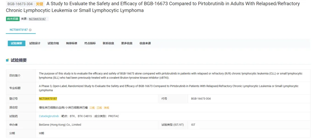 5 月 7 日,百济神州启动一项 III 期开放标签随机研究,旨在评估 Catadegbrutinib(BGB-16673)与匹妥布替尼相比在复发/难治性慢性淋巴细胞白血病或小淋巴细胞淋巴瘤(CLL/SLL)患者中的安全性和有效性。研究拟纳入 500 人,主要终点是 PFS。