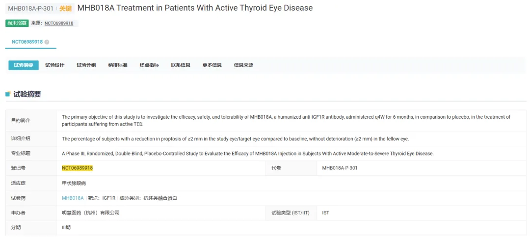 5 月 19 日,明慧医药启动了一项 III 期随机、双盲、安慰剂对照研究,旨在评估 MHB018A 注射剂对活动性中度至重度甲状腺眼病(TED)患者的疗效。该试验拟纳入 108 人,主要终点是第 24 周时的突眼反应率。
