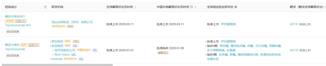 Insight 数据库显示,在 IGF-1R 单抗领域,全球仅有 2 款药物获批,首款获批上市的是安进的替妥木单抗,24 年全球销售额达 18.51 亿美元。第二款是信达的 IBI311,于 25 年 3 月首次在国内获批上市。