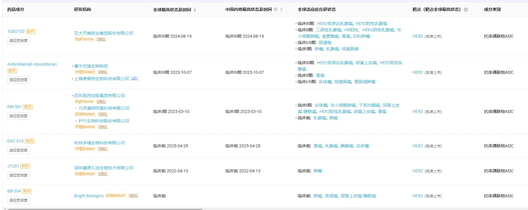 Insight 数据库显示,目前全球范围内共有 6 款 HER2 双抗 ADC 在研(仅统计积极状态),正大天晴 TQB2102 和康宁杰瑞 Anbenitamab repodatecan( JSKN-003)进展最快,已进入 III 期临床。正大天晴在 2024 年业绩报告中披露,TQB2102 有望在 2027 年上市。