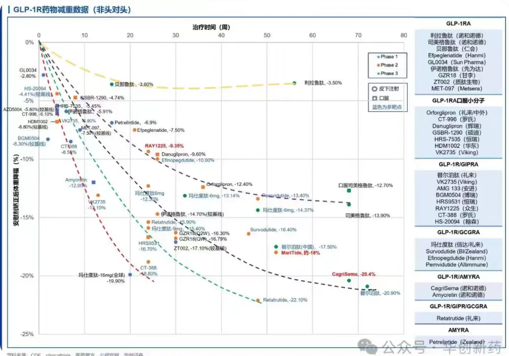 数据就是这个数据,那么我们这里仍然要用到那张华创医药组的老图了。如图所示,6mg下玛氏度肽减重12.5%,48周减重则接近16%,目前来说将玛氏度肽和谁进行对比最好呢?笔者认为是替尔泊肽,二者都是双靶点药物,代表着第二个靶点不同方向上的分歧,并且替尔泊肽已经上市了这么久,未来玛氏度肽上市肯定是来吃替尔泊肽和司美的存量市场的,那么到时候玛氏度肽能不能打得过替尔泊肽呢?从数据来看,6mg的玛氏度肽恐怕还是剂量较低,真能做到16mg,20周做出19.9%的减重也没这么多悬念。