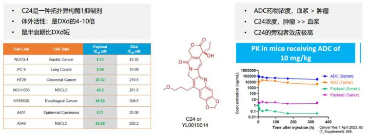 毒素方面,HLX43同样选择了升级,采用新型强效载荷毒素C24——DNA拓扑异构酶抑制剂类毒素。与毒素MMAE相比,C24毒性更强且半衰期更短,在高效杀伤肿瘤的同时,确保了较好的安全性。