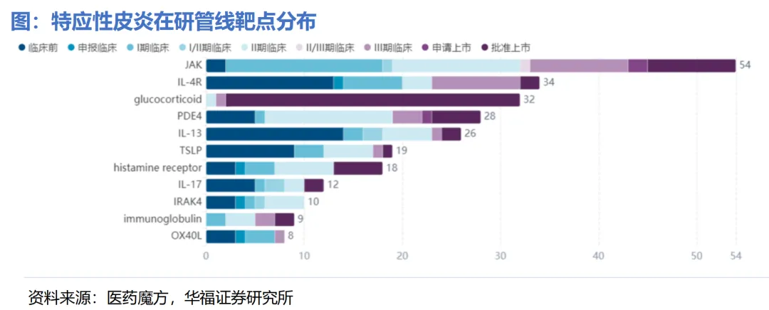 0/1(皮损完全/基本清除)数据略逊于Dupi;Lebrikizumab为代表的IL-13单抗,在一项荟萃分析的结果表示:由于只有一部分中重度AD患者能够对IL-13抑制剂有效反应,其某种程度上并不优于Dupi治疗中重度AD;TSLP单抗普遍临床进展较早,大部分未出Poc数据。