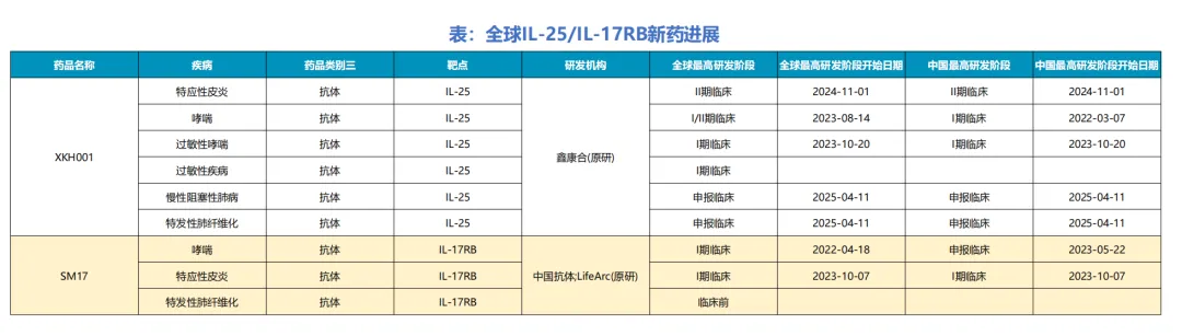 另一种路线是不少开发者选择从更上游的靶点入手,比如大家看到的TSLP靶点分子的BD潮,而中国抗体则是差异化选择了IL-25靶点,全球竞争格局良好。