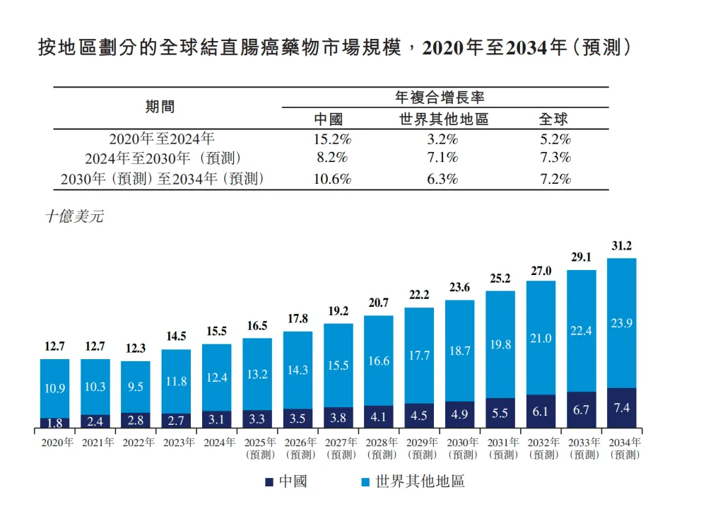 如图所示,根据沙利文咨询机构的测算,中国结直肠癌市场2024年达到了31亿美元,而全球则达到了155亿美元。到十年后的2034年,中国结直肠癌市场将翻一倍不止,达到75亿美元,而全球市场则将达到312亿美元。