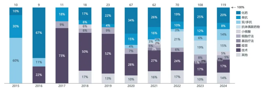 据Dealogic数据,2024年以来,全球大型药企引入的创新药项目中,有42%来自中国企业,而五年前这个比例几乎为零。2024年全年,中国创新药License-out项目达94笔,总交易金额达519亿美元,其中55%流向美国,标志着中美创新药合作已成主轴。