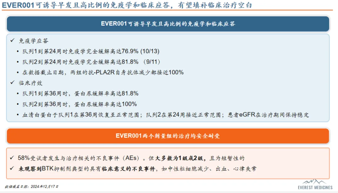 数据显示,在接受EVER001治疗的pMN患者中,低剂量组和高剂量组的患者,在接受治疗12周之后,抗-PLA2R自身抗体已分别下降62.1%和87.3%,在24周时两组的降幅均增至93%左右。