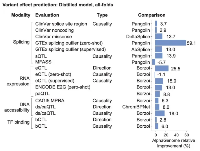 在多项测试中,AlphaGenome展示了其拥有当前DNA模型中最先进的性能。