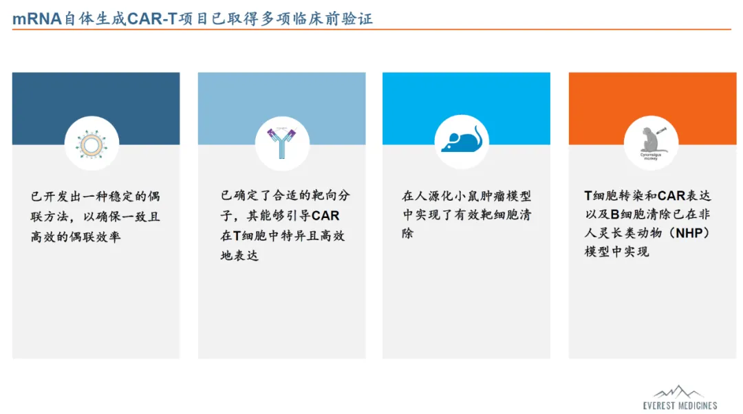 与传统体外生成CAR-T相比,基于tLNP-mRNA平台的体内自体生成CAR-T具有现货型、可大规模生成、成本更低(可能会让CAR-T的成本降低一个数量级)、无需淋巴耗竭化疗、非细胞产品质量更可控等多重优势。