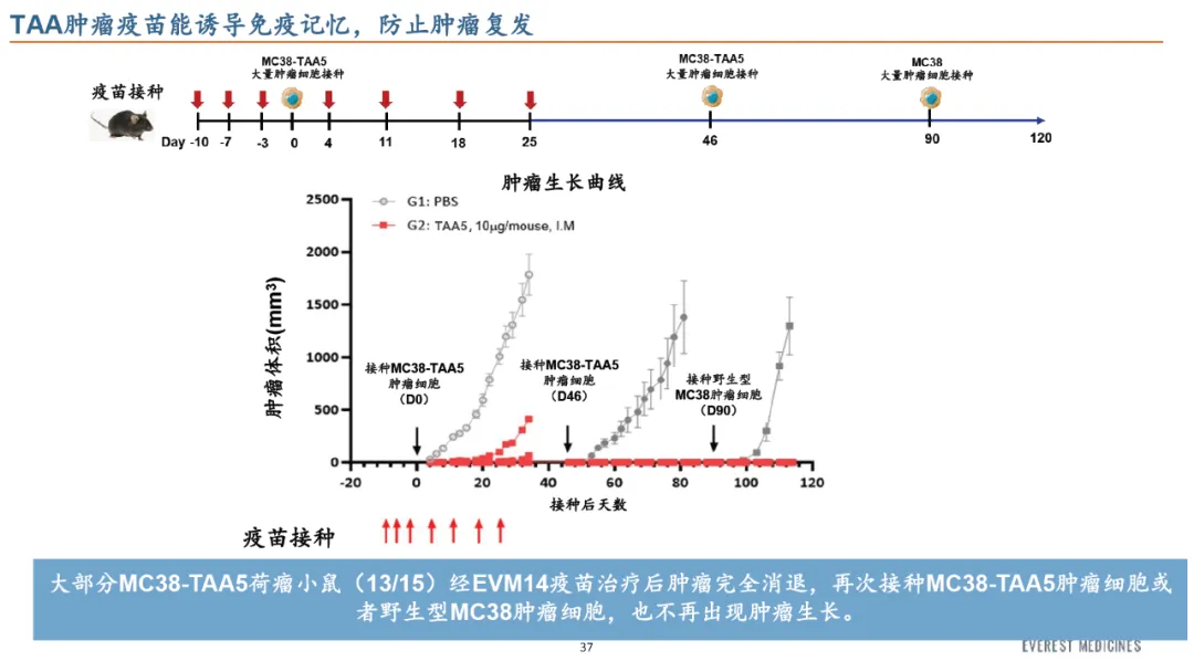 特别值得关注的是,动物模型研究表明,EVM14能够诱导免疫记忆,有效防止肿瘤复发,且展现出了“终身免疫”的潜力。如果这一潜力在临床研究中得到验证,将有望使患者实现“长期无癌生存”的获益,在肿瘤治疗领域极具开拓性意义。