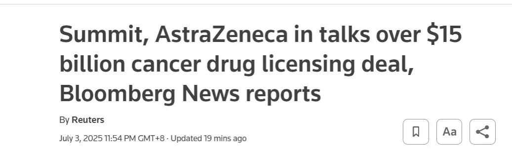 7月3日,据外媒彭博社透露,Summit Therapeutics与阿斯利康正就一项价值高达150亿美元的合作协议展开谈判。
