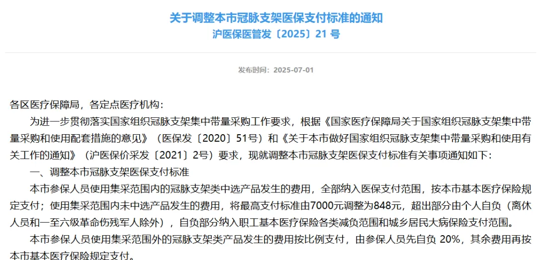 2025年7月1日,上海瑞金医院心内科的诊疗系统中,一条新的医保支付规则悄然生效:完成年度集采任务后,医院可使用医保资金为患者报销集采范围内未中选冠脉支架费用,最高支付限额848元,超额部分由患者或商业保险承担。集采范围外冠脉支架类产品发生的费用按比例支付,由参保人员先自负20%,其余费用再按本市基本医疗保险规定支付。