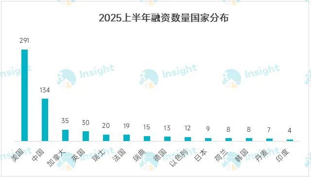 从国家维度来看:美国企业数量遥遥领先,以 291 起的融资数量排名第 1;中国位居第 2,有 134 起;其它获得融资较多的国家还有加拿大、英国、瑞士、法国,分别有 35、30、20、19 起。