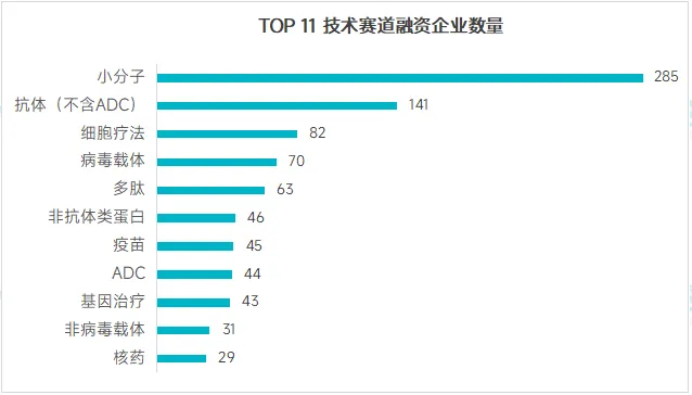 从技术赛道来看:小分子领域获得融资的企业最多,有 285 家;其次是抗体类药物(不含 ADC),有 141 家企业,其中单抗赛道企业有 123 家,双抗/多抗赛道有 45家;细胞疗法领域企业排名第 3,有 82 家。