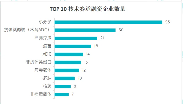 从技术赛道来看,小分子领域的融资企业数最多,有 53 家;其次是单抗领域,有 27 家企业;抗体融合蛋白排第 3,有 16 家企业;疫苗、ADC、双抗领域,各有 14 家企业。