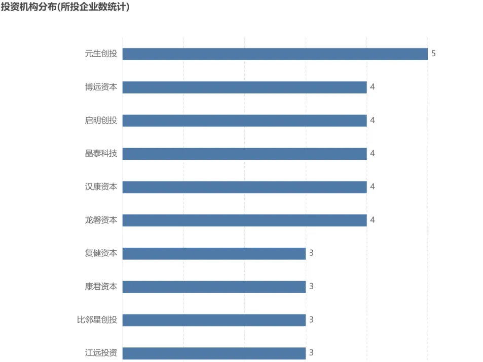 其次多的是博远资本、启明创投、晶泰科技、汉康资本、龙磐资本,每家都投了 4 家企业。其中,博远资本投了思璞锐/靖因药业/大睿生物/欧科健,启明创投投了天辰生物/浩博医药/赜灵生物/阳光安津,晶泰科技投了新樾生物/默达生物/希格生科/或然生物,汉康资本投了思璞锐/浩博医药/靖因药业/高光制药,龙磐资本投了柏全生物/泽安生物医药/纽欧申医药/微知卓生物。
