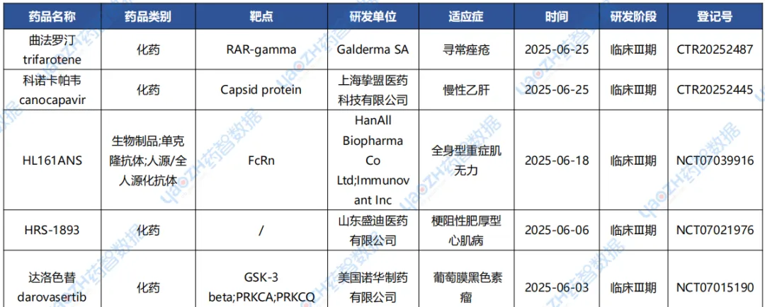 据全球药物分析系统显示,2025年6月首次进入重点临床试验(三期)的新药项目有27个,临床申请有56个,下表展示部分重点信息,完整信息可通过全球药物分析系统进行查看。