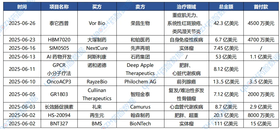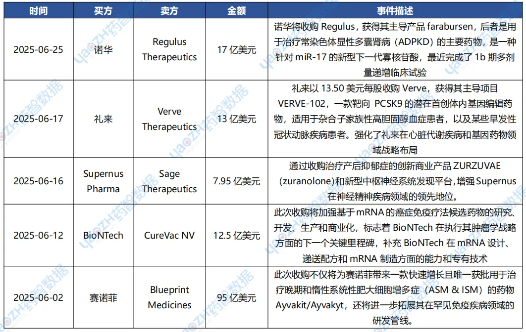 据药智数据【投资格局】统计,2025年6月共316条医药交易事件、168条医药投融资事件和29项企业并购事件发生,重点交易信息如下,完整清单详见市场投资格局数据库。