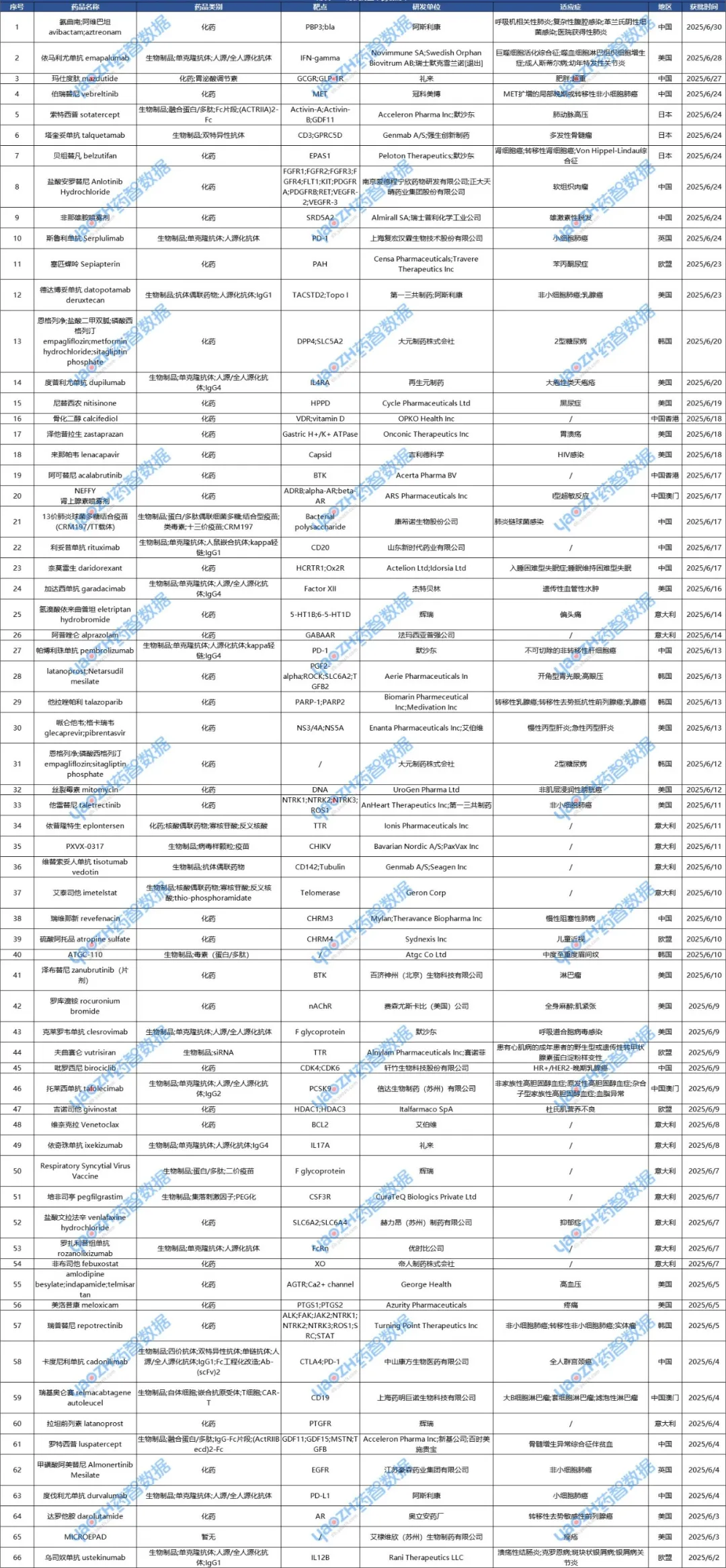 据全球药物分析系统显示,6月全球共66款新药获批上市(包括新获批适应症),其中境外47个上市药品,中国境内19个药品,下表展示部分重点上市药物,文末附完整清单,更多药品信息可通过全球药物分析系统进行查看。