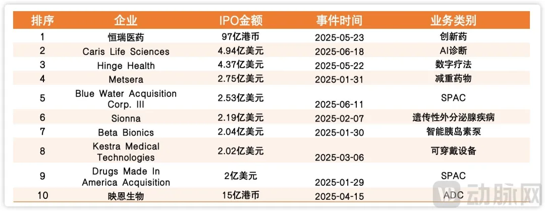 在国内,和往年被生物医药霸榜不同,2025H1国内融资TOP10榜单生物医药和器械耗材相对均衡。