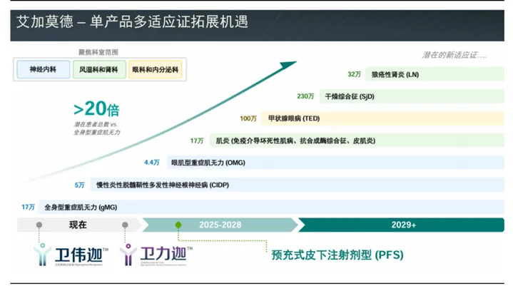 除了已获批的重症肌无力和CIDP适应症,艾加莫德在自身免疫性疾病领域的适应症拓展正稳步推进。目前,眼肌型重症肌无力、干燥综合征、甲状腺眼病、肌炎等适应症已在全球范围内进入临床III期或关键性临床阶段。其中,针对眼肌型重症肌无力和干燥综合征的研究进展预计2025年将在中国启动注册性研究,或启动全球注册性研究的中国部分。