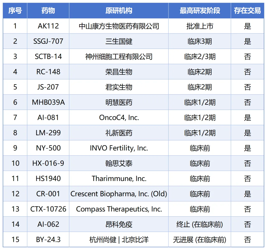 3)单独自研:如SSGJ-707、MHB039A、PM-8002、HB0025、B1962所用PD-(L)1结合片段为单独自研;
