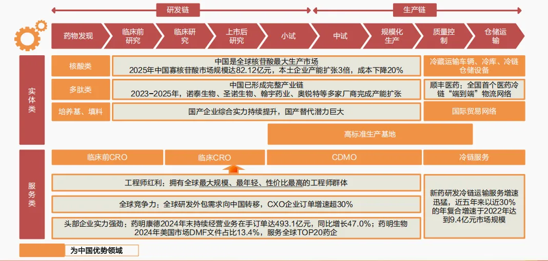 实体领域,中国是全球核苷酸最大生产市场,多肽药形成完整产业链,培养基等领域国产替代潜力大;在质量控制和仓储运输领域,冷链及物流、国际贸易网络进一步增强了创新药相关配套产业的活力;服务领域,中国工程师资源优势显著,研发外包需求向中国持续转移,药明康德等头部企业实力强劲,新药研发冷链服务增速近30%。