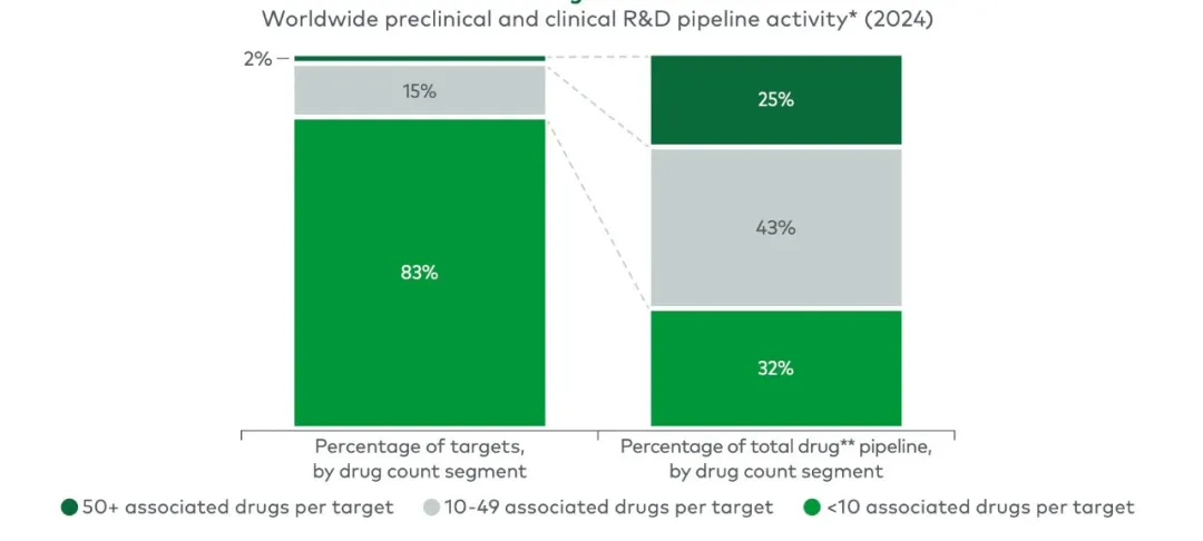 与此同时,行业里约13600个“药物–靶点”配对中,四分之一都挤在38个靶点上。大家都乌央乌央的在确定性很高的领域或靶点里“卷”。