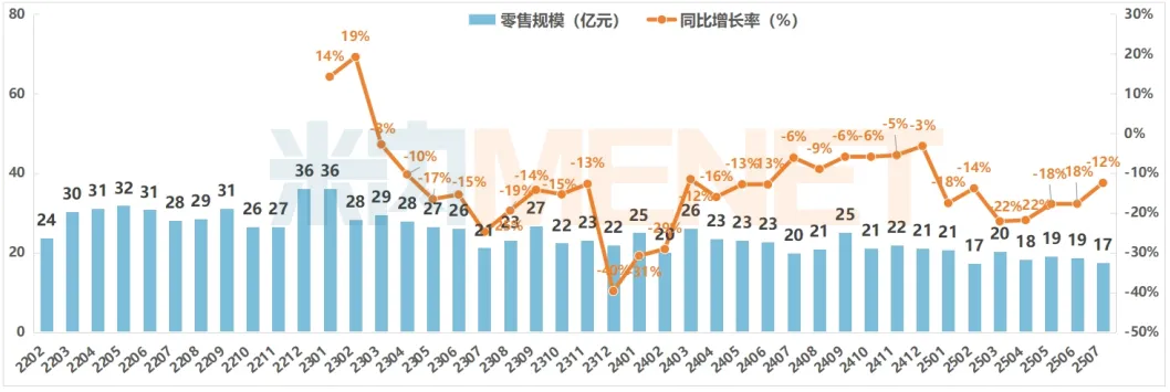 2025年7月,中国实体药店保健品零售规模为17亿元,规模与上月减少了2亿元,与去年同期相比,也有12%的降幅。