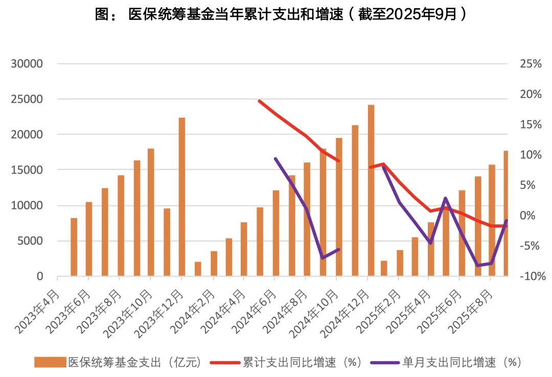 2025年1-9月,医保统筹基金累计收入21086亿元,同比增长5%,医保统筹基金累计支出17280亿元,同比下降2%,其中9月收入2276亿元,同比下降11%,支出1847亿元,同比下降1%。