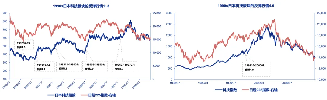 据申万宏源研究,上世纪90年代日本地产泡沫破裂后,科技板块的反弹共计4次。以1995年为分界点,科技行情的主要驱动力从日本股市beta回暖切换至独立产业趋势,市场交易风格也从小盘股+非基本面切换至大盘股+基本面。主要表现为:反弹1.0中,科技板块与日经225反弹的节奏总体一致,主要涨小盘风格,股价未对业绩因子充分定价;而1995年之后,反弹2.0~反弹4.0均为大盘风格占优,且强势个股具有更好的基本面特征。