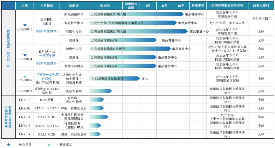 核心产品LNK01004,一款有潜力成为同类首创的第三代软性泛JAK抑制剂,靶向自身免疫及炎症疾病。公司已于2025年7月在中国完成靶向特应性皮炎的LNK01004 II期试验,并计划于2027年上半年启动III期试验。