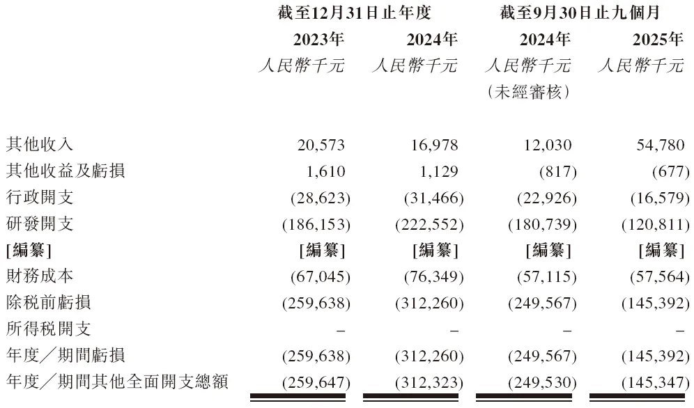 招股书显示,在过去的2023年、2024年和2025年前六个月,凌科药业未有营业收入,相应期间的研发费用分别为人民币1.86亿、2.23亿、1.81亿和1.21亿元,相应期间的净亏损分别为人民币2.60亿、3.12亿、2.50亿和1.45亿元。