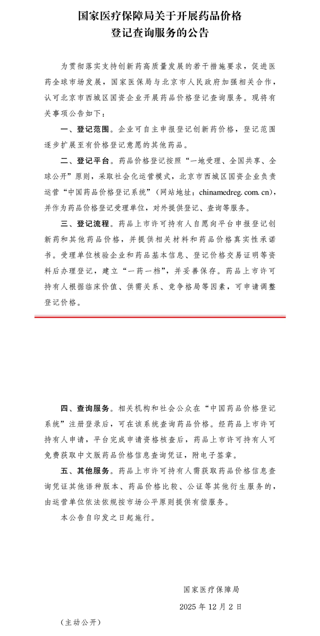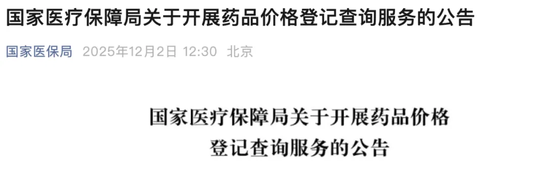 2025年12月2日,中国药品价格登记系统上线(文末附《国家医疗保障局关于开展药品价格登记查询服务的公告》)。