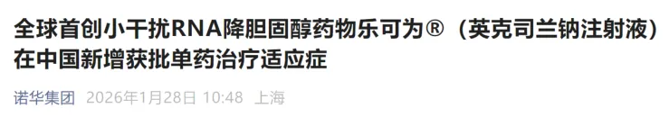 1 月 28 日,诺华宣布,「英克司兰钠注射液」(商品名:乐可为®)新适应症获得 NMPA 批准,作为饮食的辅助疗法,单药用于成人原发性高胆固醇血症(非家族性)或混合型血脂异常的患者,以降低低密度脂蛋白胆固醇(LDL-C)。