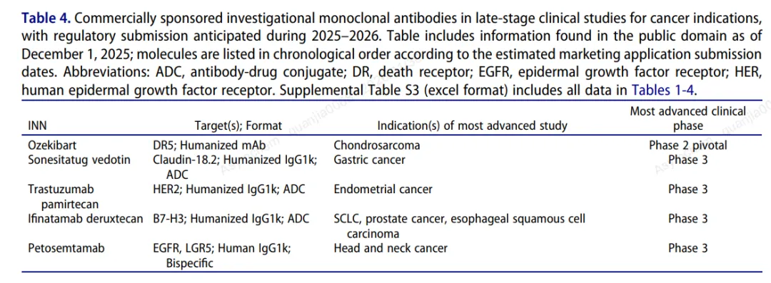 另外,处于后期研究阶段的抗体新药中,根据申办公司或多家公司的公开披露信息以及正在进行的后期临床研究的预计主要完成日期推断预测,有21款抗体新药有可能在2026年递交上市申请。其中16种用于非癌症治疗,5款用于癌症适应症。