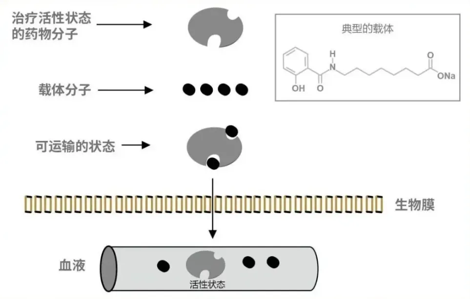 由于司美格鲁肽是多肽类药物,口服经过胃部的低PH值、蛋白水解酶活性高的环境使其快速被降解,进而呈现生物利用度极低的特征;利用渗透促进剂SNAC修饰司美格鲁肽有几个核心好处:1)局部中和胃酸、抑制胃蛋白酶活性,显著提升药物半衰期;2)SNAC促使司美格鲁肽形成更易穿透的单体构象,提升司美的渗透性;3)SNAC具有亲脂性并可插入胃上皮细胞膜,让司美以溶解-扩散形式进行跨膜运输;4)SNAC锚定司美的吸收部位集中在胃部,而非更复杂的肠道环境。