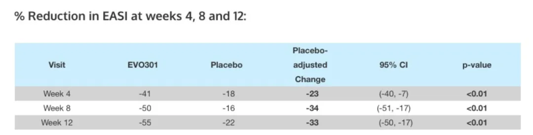 另外,在第 12 周时,EVO301 治疗组中有 23% 的患者达到了vIGA-AD 0/1 的标准(而安慰剂组无一达到此标准),这意味着他们的皮肤已经痊愈或几乎痊愈。