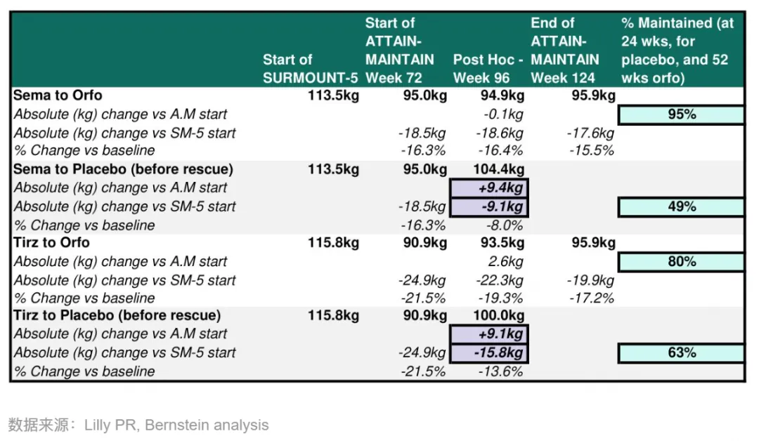 目前礼来的Orforglipron已经在GLP-1停药维持阶段做出了一定数据,据其ATTAIN-MAINTAIN试验结果回顾:使用最大耐受剂量的司美格鲁肽(1.7mg-2.4mg)和替尔泊肽(10-15mg)分别达成一定减重效果后,换用Orforglipron可分别维持其95%和80%的减重效果,该数据基础也是部分KOL在Orforglipron上市后更愿意开具Orforglipron处方的原因之一。