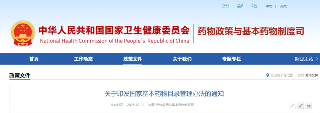 2月11日,国家卫健委发布关于印发国家基本药物目录管理办法的通知的公告,办法自发布之日起施行。原国家卫生计生委2015年2月13日印发的《国家基本药物目录管理办法》(国卫药政发〔2015〕52号)同时废止。