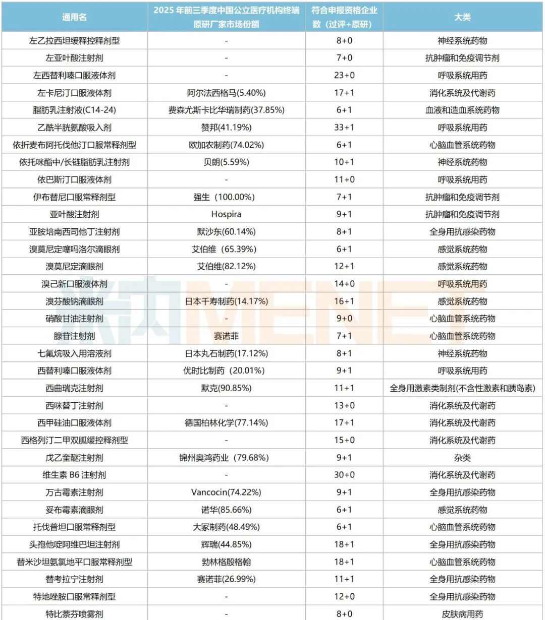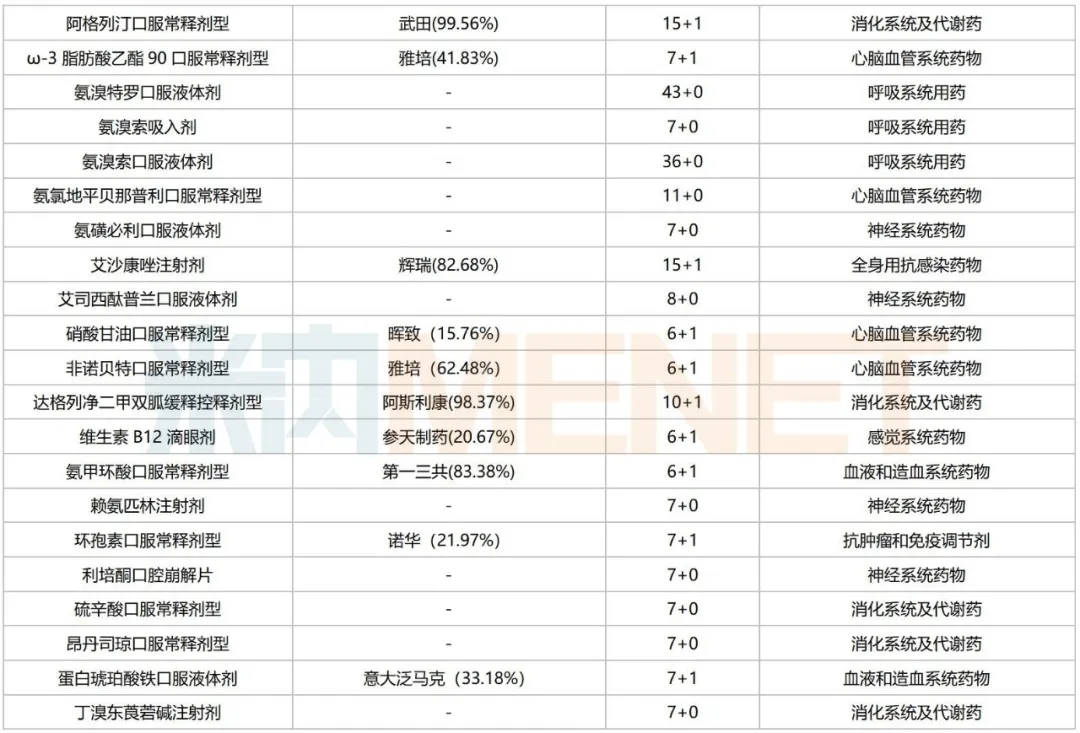 20个“火爆”品种中,有14个满足条件但因各种原因而未纳入第十一批集采,其中米诺地尔外用液体剂符合申报企业数已超50家,乳果糖口服液体剂、氨溴特罗口服液体剂、伏诺拉生口服常释剂型均达40家及以上,沙库巴曲缬沙坦口服常释剂型2025年前三季度在中国公立医疗机构终端的销售额接近50亿元等。