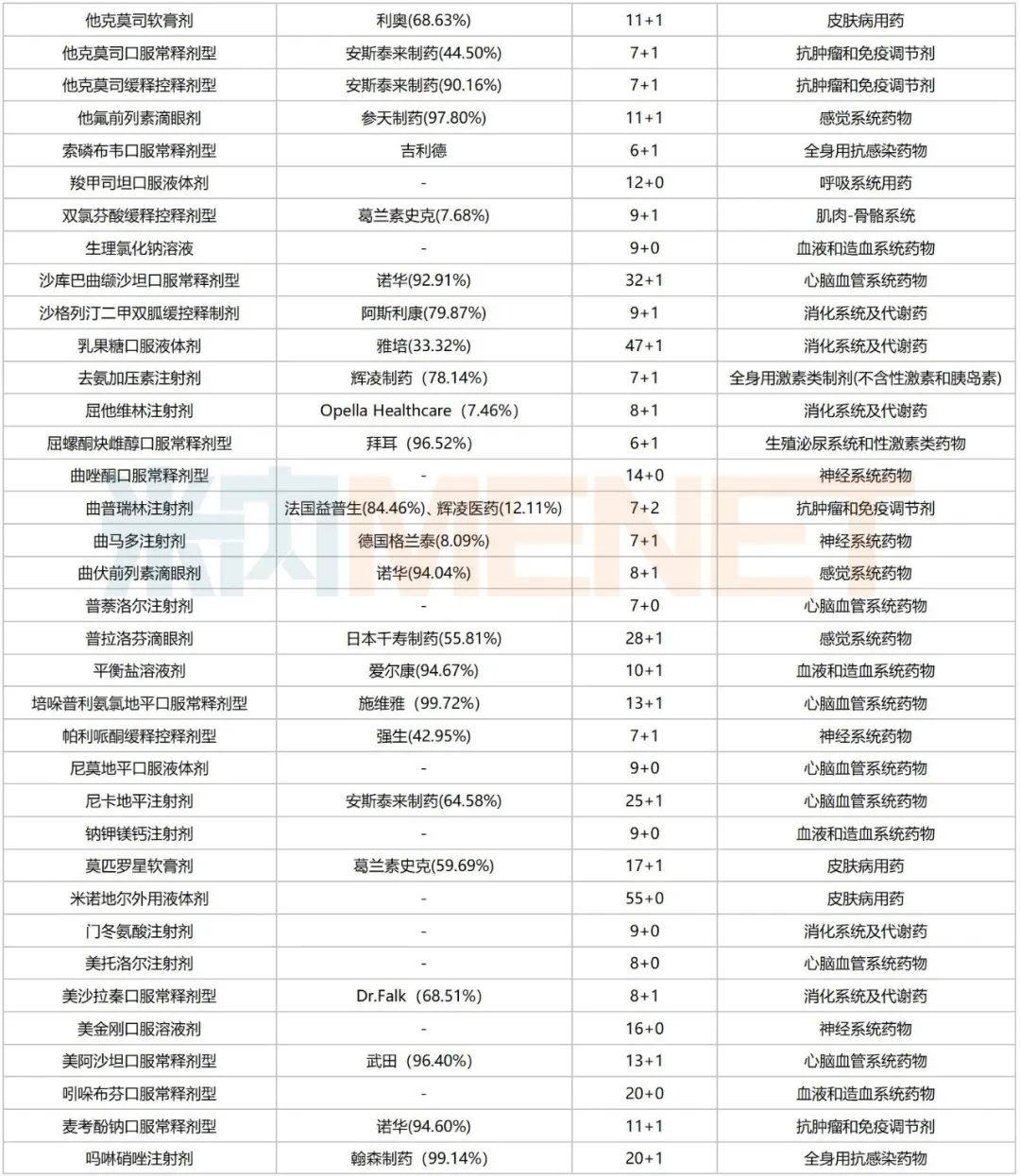 从企业情况看,预计在第十一批国采中,倍特药业、齐鲁制药、石家庄四药、科伦药业、复星医药、远大健康等为“主力军”,目前满足7家及以上的竞争条件的过评品种分别有38个、34个、32个、31个、30个、30个。