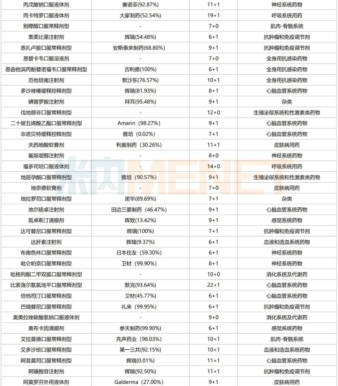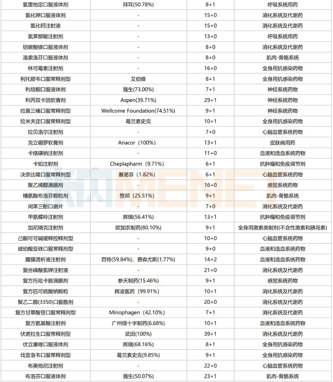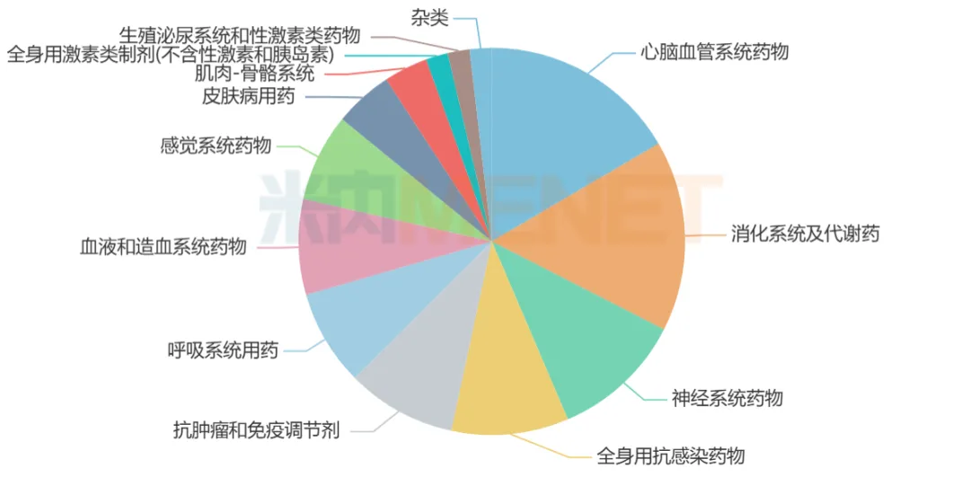 从治疗领域看,163个品种涵盖13个治疗大类,集中在心脑血管系统药物、消化系统及代谢药、神经系统药物等,涉及的品种数分别达27个、26个、18个,占比均超过10%。