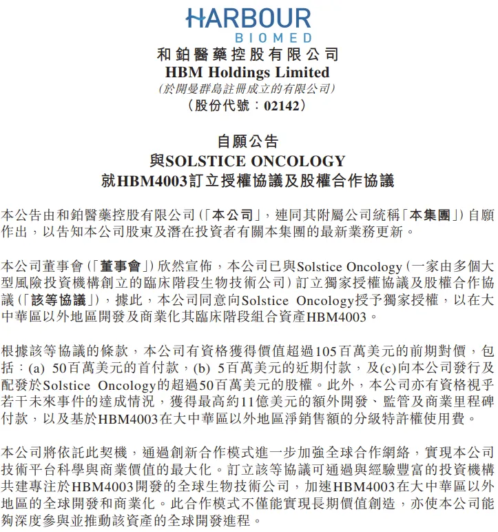 和铂医药此次与 Solstice Oncology 的合作,在交易结构上展现出了 NewCo 模式的典型特征与创新之处。从对价结构来看,和铂医药获得了 5000 万美元首付,这一现金流入能在短期内为公司补充研发资金,支持其他管线的推进 ;还有 500 万美元近期付款,保证了资金到账的及时性,让公司对资金规划有更明确预期。超 5000 万美元股权的获取则意义深远,和铂医药不再仅仅是将产品权益一卖了之,而是成为 Solstice Oncology 的股东,与该公司的利益深度绑定。当 Solstice Oncology 未来发展良好,无论是通过上市还是被并购,和铂医药都能获得股权增值收益 。此外,最高 11 亿美元里程碑付款及销售分成,这部分收益与 HBM4003 的研发进展、商业化成果挂钩,激励着双方共同努力推进项目,实现产品价值最大化。